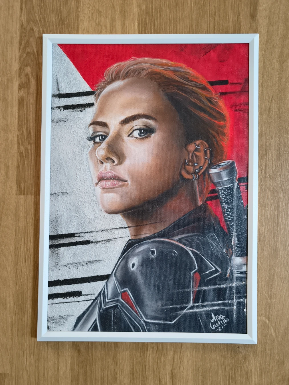 Viuda Negra, la jefaza!!💪😎🍿ya me gustaba en los Vengadores pero en su peli…buah! tenia que ir corriendo a pintarla🎨 fue mi primer retrato con oleo al agua🤩.